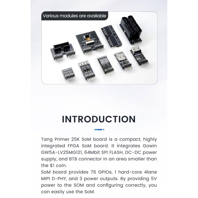 - [Rich Peripheral Pins] Tang Primer 25K Dock development board integrates Gowin GW5A-LV25MG121, 64Mbit SPl FLASH, DC-DC power supply and BTB connector. Its core board leads to 76 GPIOs and 1 hard core 4lane MIPI line and 3 power outputs for users to use.