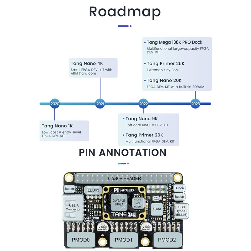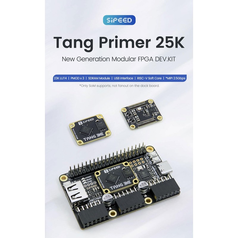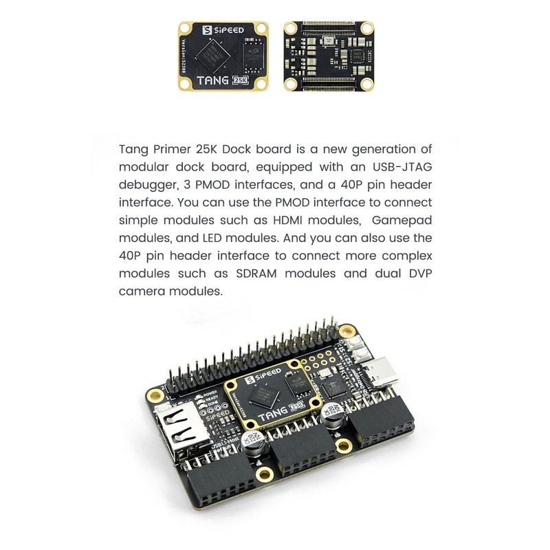 - [FPGA RISCV CPU] Tang Primer 25K Dock single board computer is a new generation of modular development board with onboard RISC-V soft core, 23K LUT4 FPGA GW5A RISCV CPU, supports MIPI 2.5Gbps Ethernet, and is equipped with a USB-JTAG debugger , 3x PMOD interface, 1x USB interface and 1x 40P pin header interface to facilitate FPGA programming.