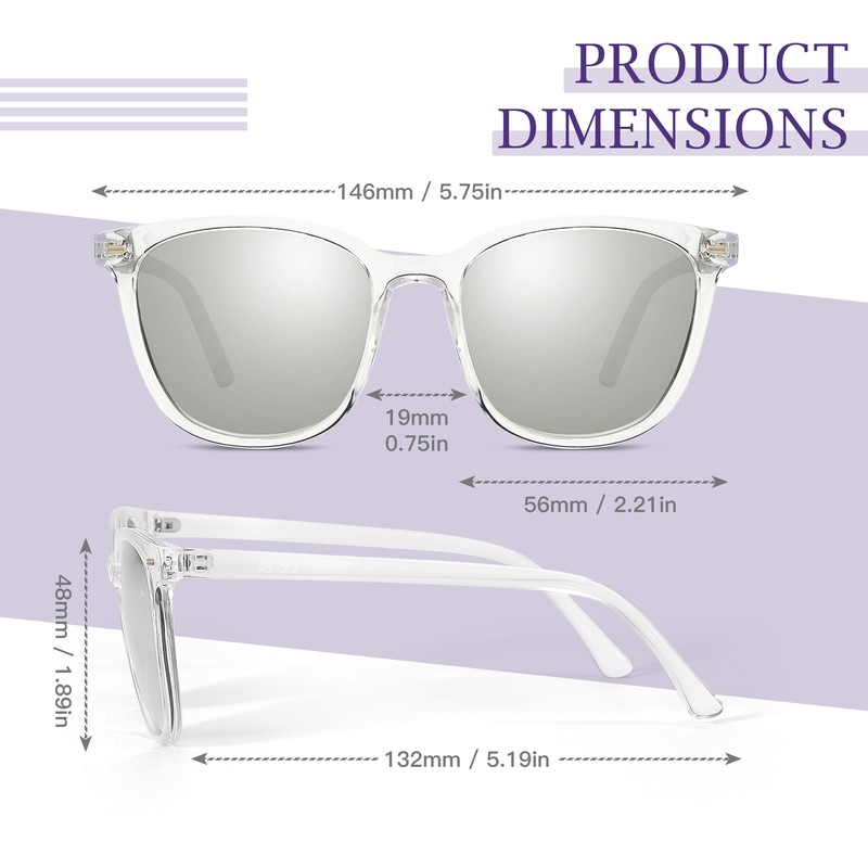 - Oversized Square Frame Sunglasses: 56 x 55 mm square frame designed for sunglasses enthusiasts with a face width of 135-155 mm. These 56mm wide lenses + 19 mm nose bridge balance facial proportions The 140 mm temples grip securely without pinching—no more sliding down or red marks.