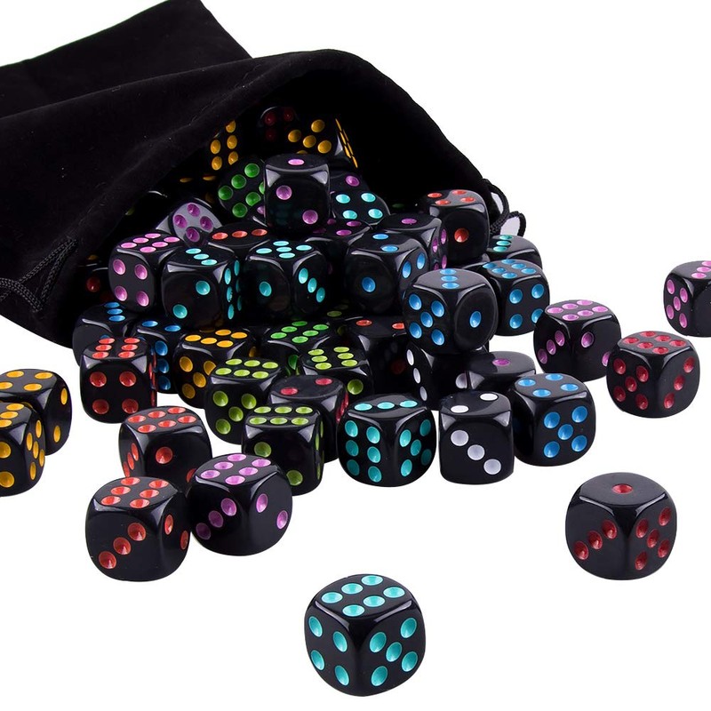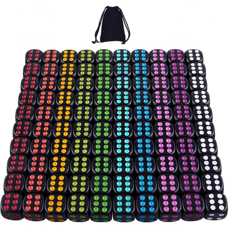 - Package includes: 100 pieces 6 sided black dice, the pips in 10 different colors, 10 pieces for each color