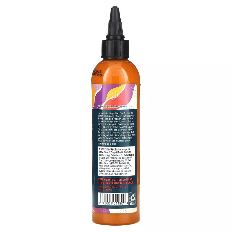 High oleic sunflower oil, water, gochujang (water, tapioca syrup, brown rice, red pepper, salt, alcohol (to preserve freshness), garlic, onion), garlic juice, organic certified humane free range egg yolks, toasted sesame oil, distilled vinegar, gochugaru (red pepper), tamari (water, soybeans, salt, cane sugar), salt, rice vinegar, xanthan gum, mushroom powder, citric acid, rosemary extract, mustard extract.