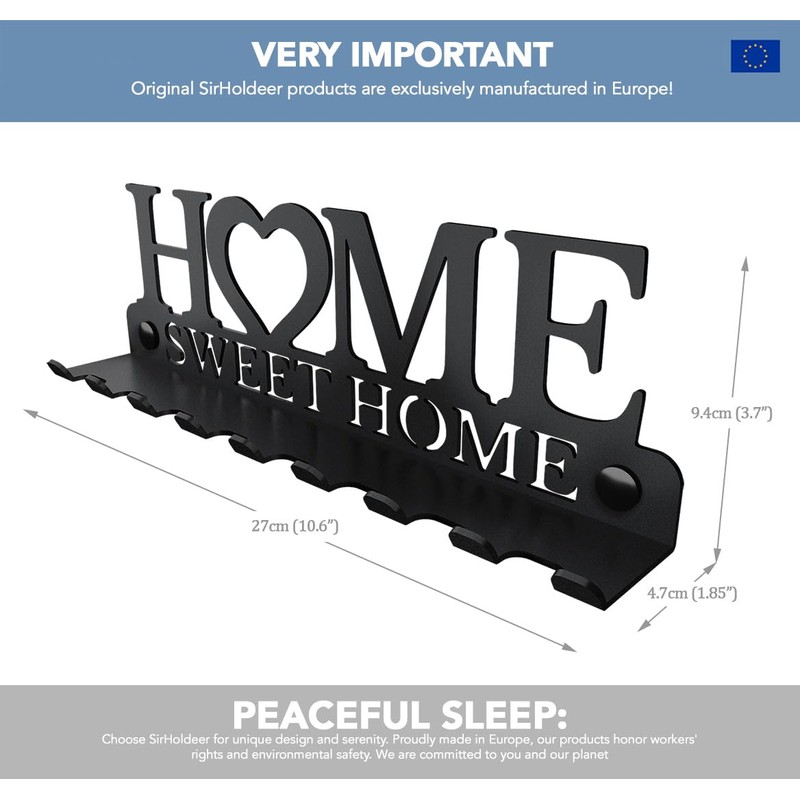 SirHoldeer Home Sweet Home Wall Mounted Key Rack with Letter Tray Shelf - Decorative Holder with 9 Hooks - Easy Assembly Resistant Stainless Steel Black 270 x 96 mm
