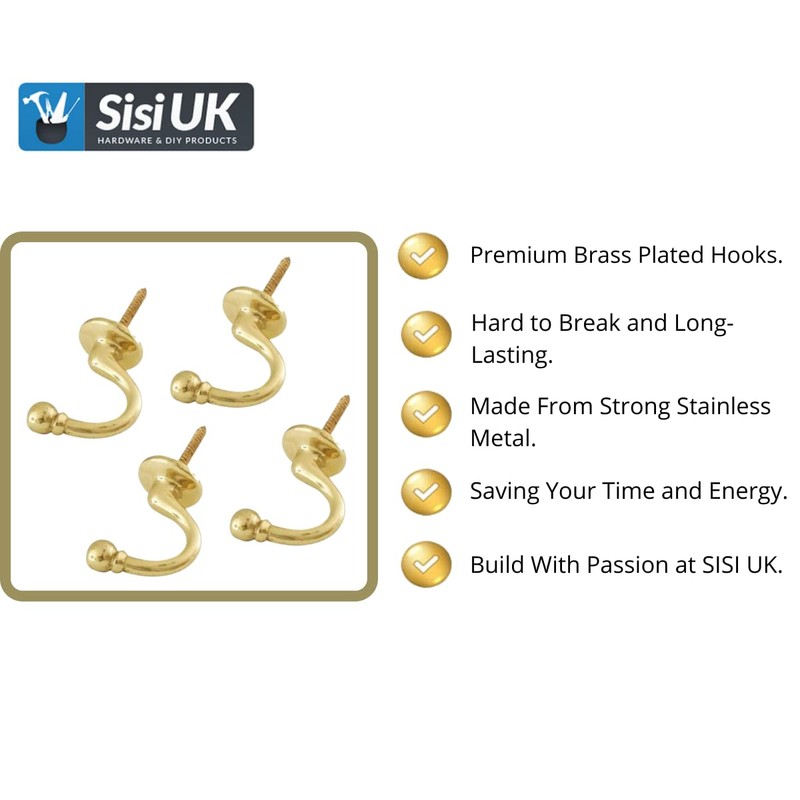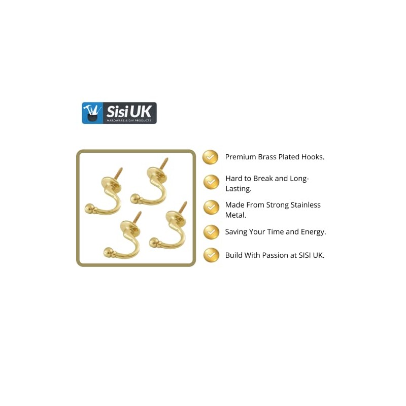 SISI UK Brass Curtain Tieback Hooks (Pack of 4) - U Shaped Ball End Hooks for Curtains, Clothes, Hanger