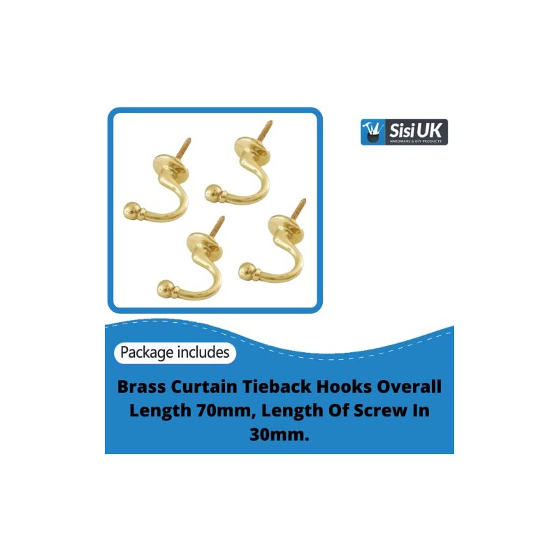 - Package Contains: 4pcs Brass curtain tieback hooks and screws, easy to wipe clean. Overall Length 70mm, Length Of Screw In 30mm, Protrusion From Wall When Fitted 40mm Diameter Of Hook (Gap Between Hook) 18mm.