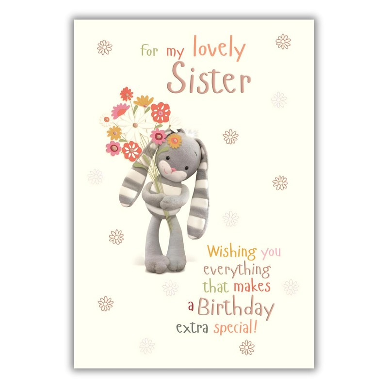 - 🎂 PRETTY BIRTHDAY CARD: A feminine card featuring a bunny rabbit holding artistic flowers, surrounded by flowers, with the message "For my lovely Sister. Wishing you everything that makes a birthday extra special".