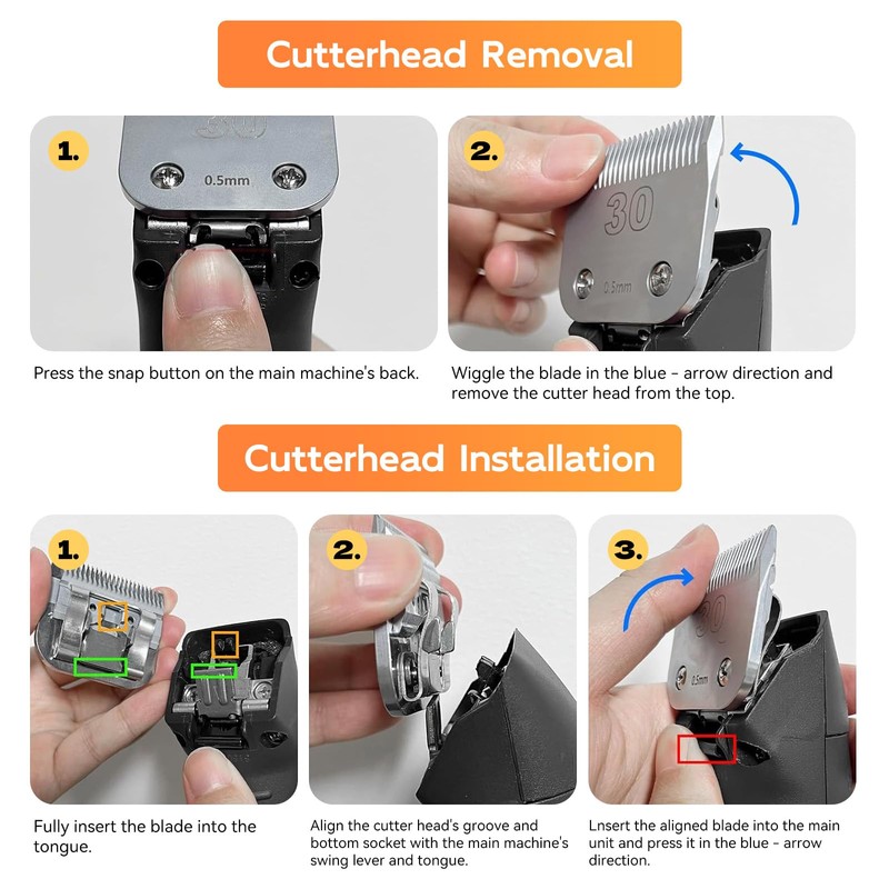 • Shearing Lengths: The blades come in three sizes for cutting lengths: #30 blade at 1/50" (0.5mm), #10 blade at 1/16" (1.5mm), and #7F blade at 1/8" (3.2mm). Can easily remove hair from a pet's face, paws, sensitive areas, ears, and tail, making them ideal for medium/long-haired dog breeds.