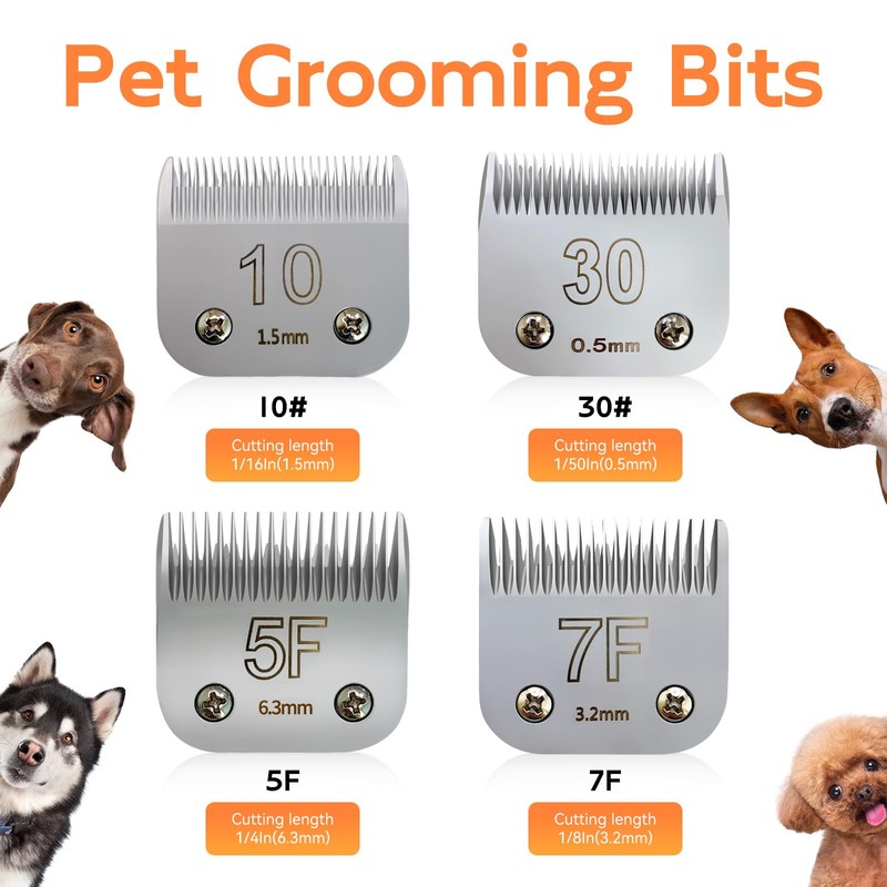 Shearing Lengths: The blades come in three sizes for cutting lengths: #30 blade at 1/50" (0.5mm), #10 blade at 1/16" (1.5mm), and #7F blade at 1/8" (3.2mm). Can easily remove hair from a pet's face, paws, sensitive areas, ears, and tail, making them ideal for medium/long-haired dog breeds.