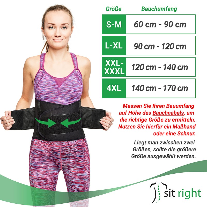 - ✔ Strong supportive effect, available in 3 sizes – from S - M (60 - 90 cm), L - XL (90 - 120 cm) to XXL - XXXL (120 - 150 cm). [Please measure the waist circumference at the height your belly button]. Flexible support struts along the spine in the back belt provide extra support. To ensure a perfect posture - both for women and men - the Sit Right back support belt is ideal.