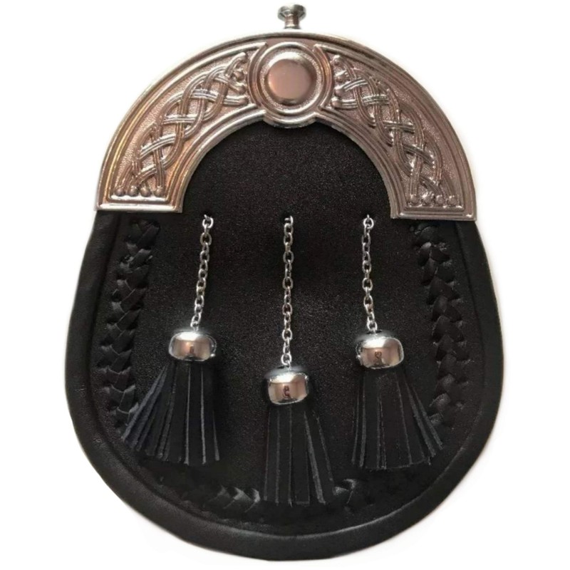 SITARAZ Kilt Sporran Cross Chain 3 Tassels, Black Leather With Chain Belt, Cantle Traditional Design For Men STRZ-007