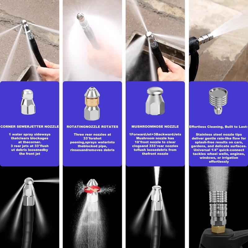 - 【SITIMIMIL Plumbing Jetter Kit】 Includes M22-to-1/4" quick-connect 4 specialty nozzles, and TPE-coated hose - everything contractors need for drain jetting jobs.