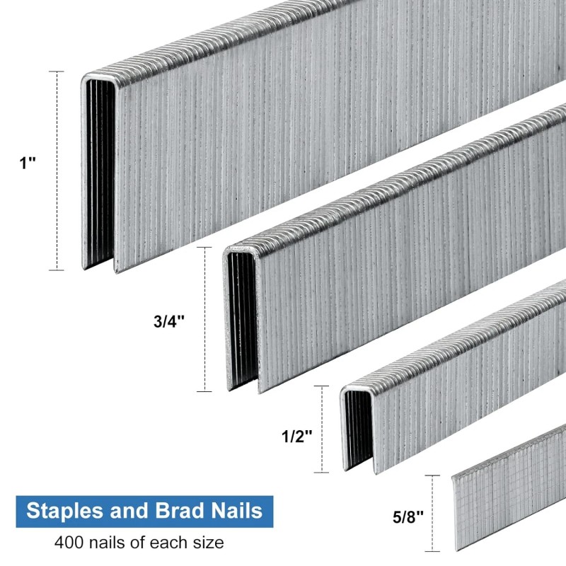 - Various sizes: the nails has 4 different sizes including 1/4" crown finish staples:1/2 inch, 3/4 inch,1inch,Brad nails:5/8 inch, You can choose different sizes of nails according to actual needs.