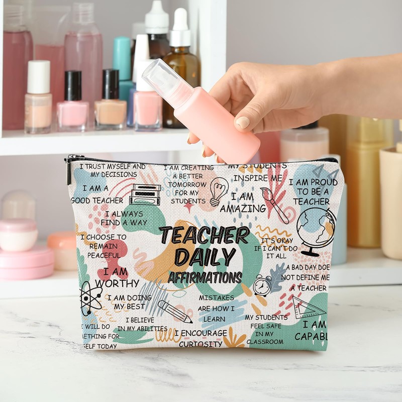 - Empowering Daily Affirmations: Featuring uplifting affirmations like "I am proud to be a teacher" and "I choose to remain peaceful," this makeup bag serves as a daily source of motivation and encouragement for teachers