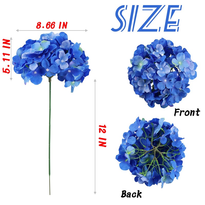 - 【Size of Fake Hydrangea】The hydrangea flower head is 8.66" in diameter and 5.11" in height. Stem height is 12 inches. Each flower head has 90 petals and the flower head is in bloom.