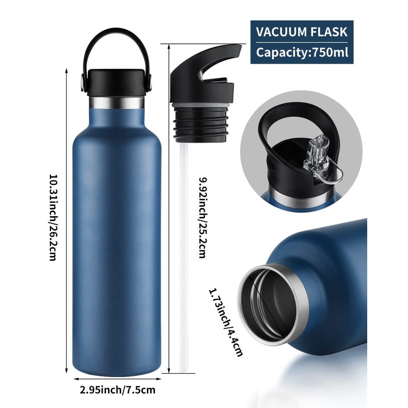 Sivaphe Water Bottle Insulated Double Walled Drink Flasks Bottle for Sports Outdoor, Stainless Steel Vacuum, Leak-Proof, with lids and Straw, 750ml, Blue