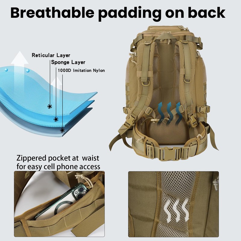 - Customizable Comfort:Featuring an adjustable internal suspension system and a detachable waist belt,this tactical backpack for men offers a customized fit.The breathable back pad,made of mesh and sponge layers,ensures maximum comfort and heat dissipation during long trips