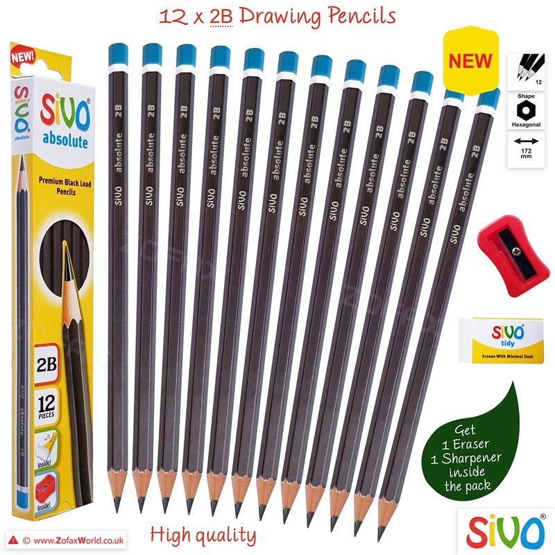 SIVO Professional Artist Drawing Pencils Value Pack Draw Sketch Tone Shade (12 x 2B Grade Pencils + Sharpener + Eraser + 1 x ZOFAX Black Pen)