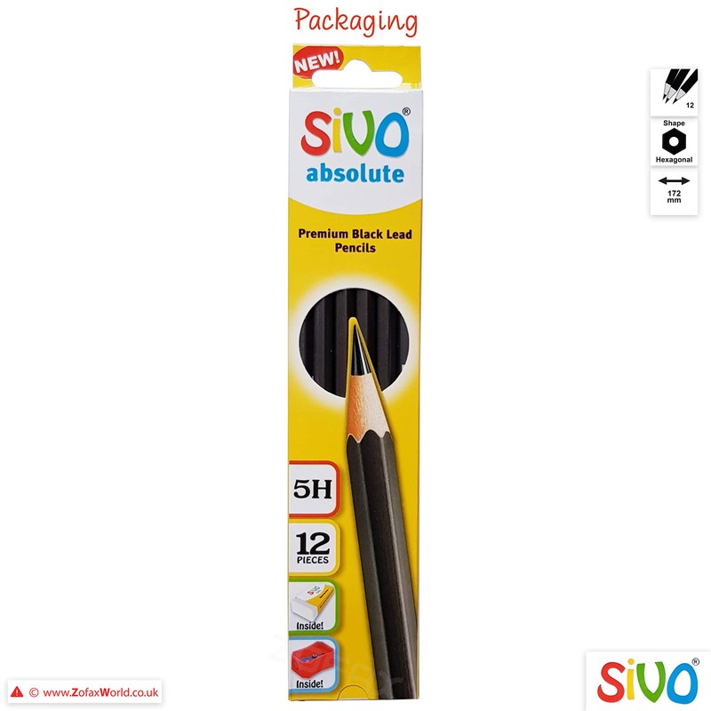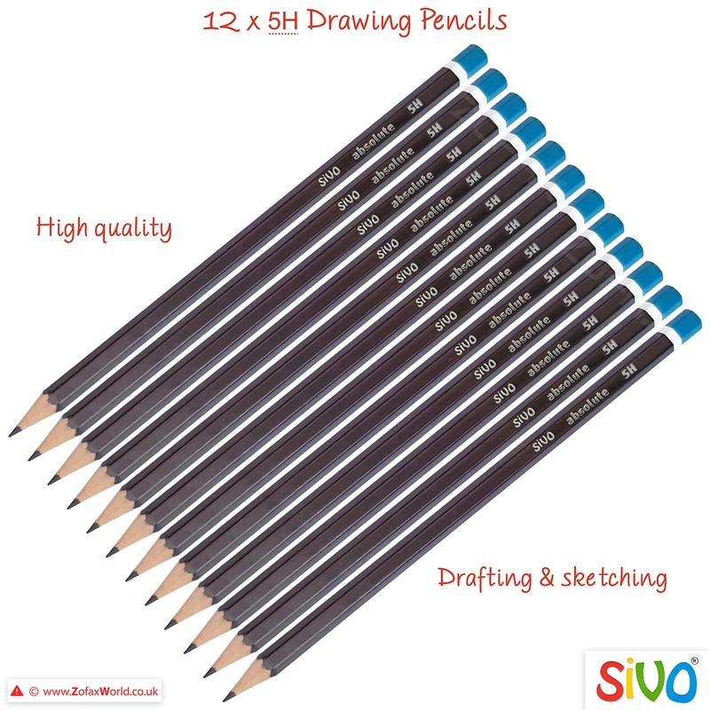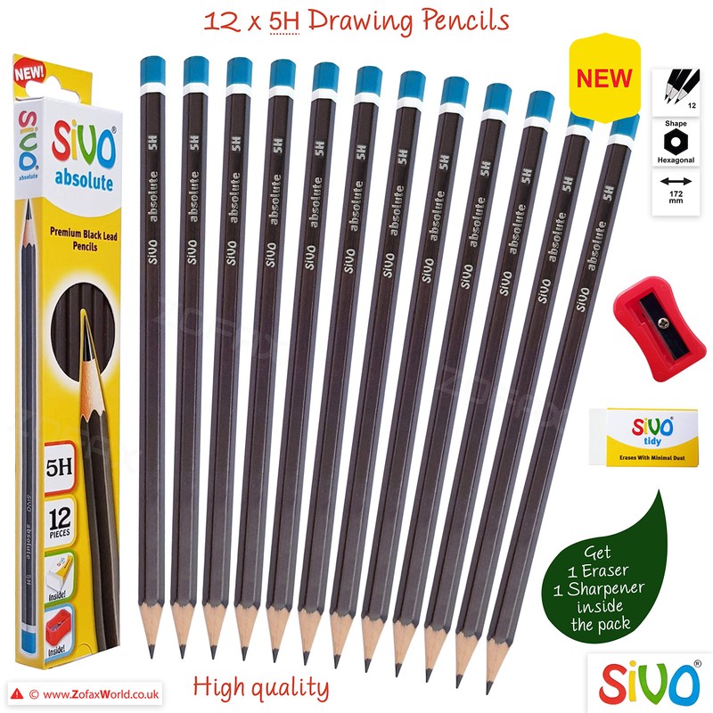 SIVO Professional Artist Drawing Pencils Value Pack Draw Sketch Tone Shade (12 x 5H Grade Pencils + Sharpener + Eraser + 1 x ZOFAX Black Pen)