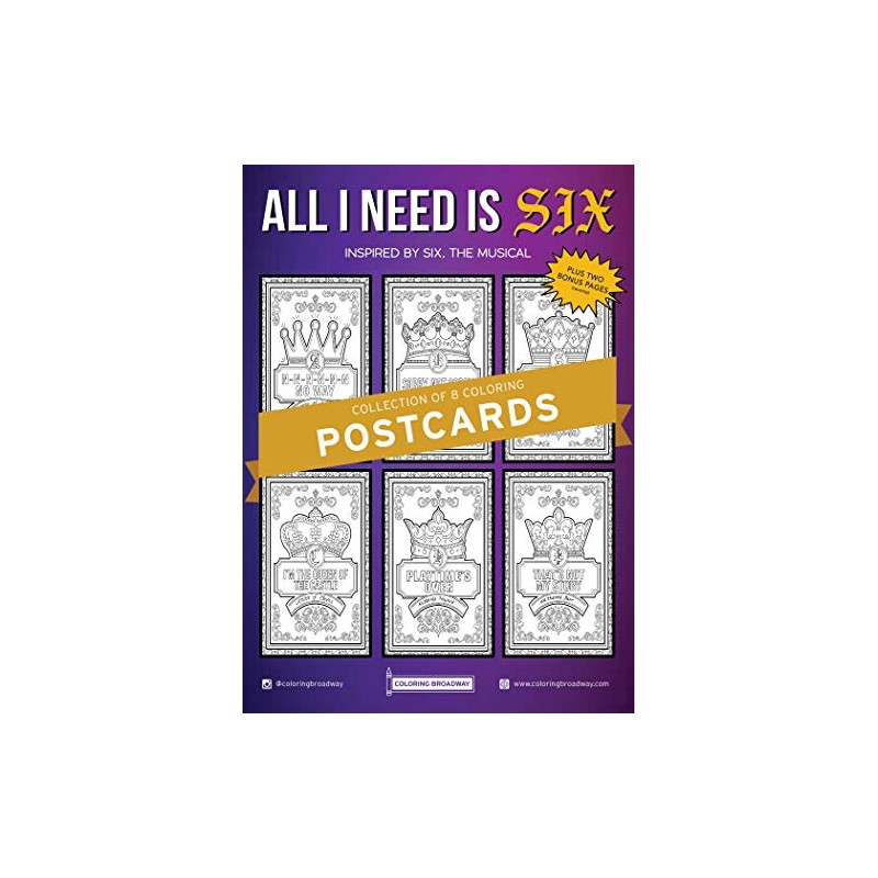 - Set of 6 beautifully designed Broadway inspired coloring Postcards featuring quotes from the musical: SIX. PLUS, get 2 additional designs as a bonus offer!