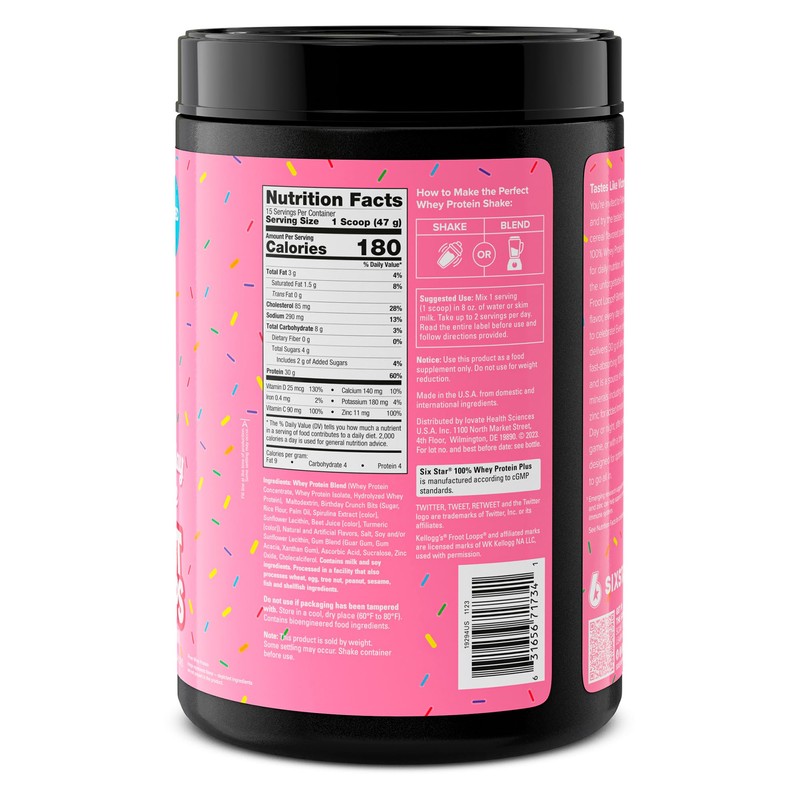 - WHEY PROTEIN POWDER ?C Formulated with 30g of protein from ultra-pure 100% whey protein and an added immune support matrix, Six Star 100% Whey Protein Plus Froot Loops Birthday Cake flavor is a wish come true.