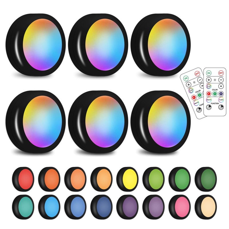 SIXDEFLY Wireless 16 Color Changing LED Puck Light 6 Pack LED Under Cabinet Lighting Closet Light Battery Powered Night Lights with Remote Control Dimmer & Timing Function