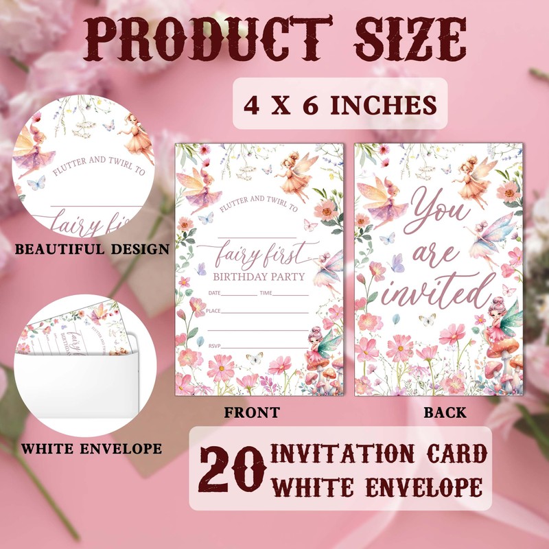 SIXEIGHT Fairy First Birthday Party Invitations, 1st Birthday Party Supplies, 20 Fill-in Style Birthday Party Invitations with Envelopes for Girls Boys, Birthday Party Favor & Decoration (4"x6")-B29