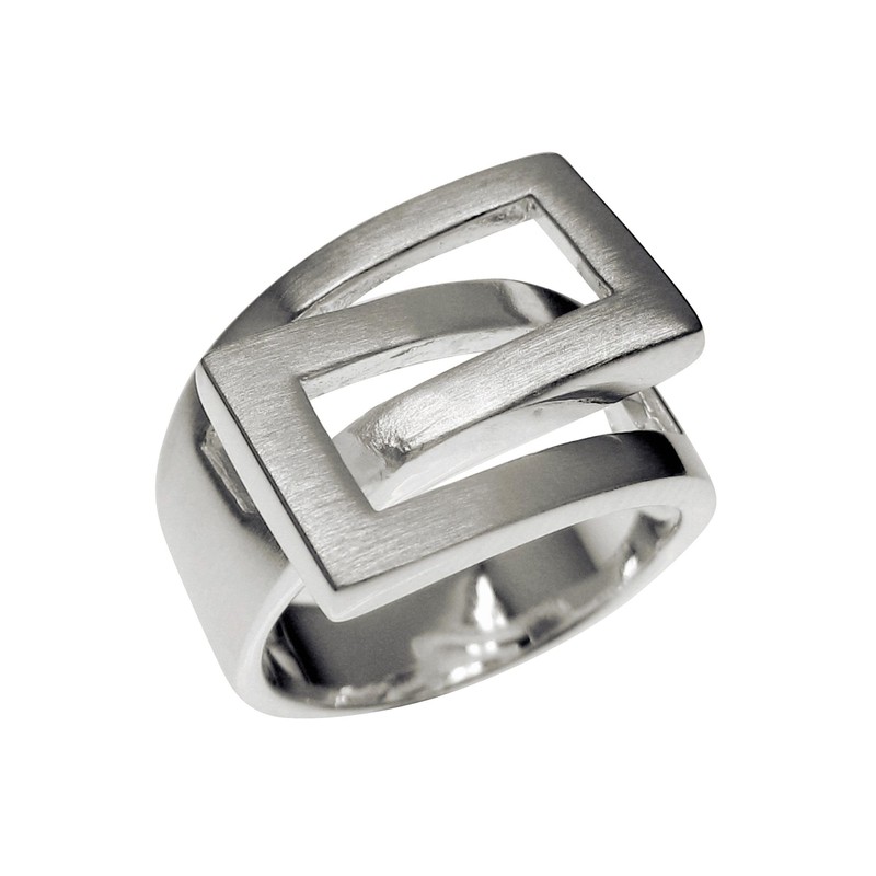 This spectacular design ring is just the right piece for all ladies who love unusual and unconventional jewellery. The ring band is solidly manufactured at the bottom and divides on the sides and opens into two squares that cleverly interlock in their closed shape. This creates a geometric look where you look not only once or twice, but preferably several times.