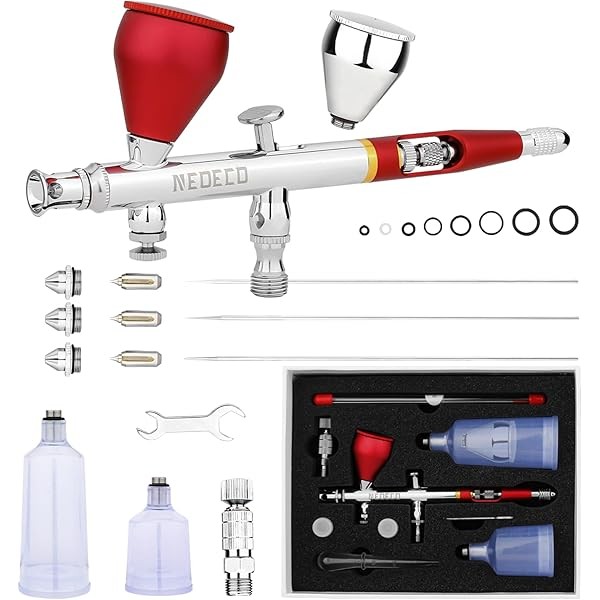 SJ83 Airbrush, Self-Centring Plug-in Nozzle,0.2, 0.3 & 0.5mm Nozzle Sets and 1/3 oz Cup, Dual-Action Gravity Feed Airbrush with 1/3 oz,2/3 oz,4/3 oz Replacement Cups (RED)
