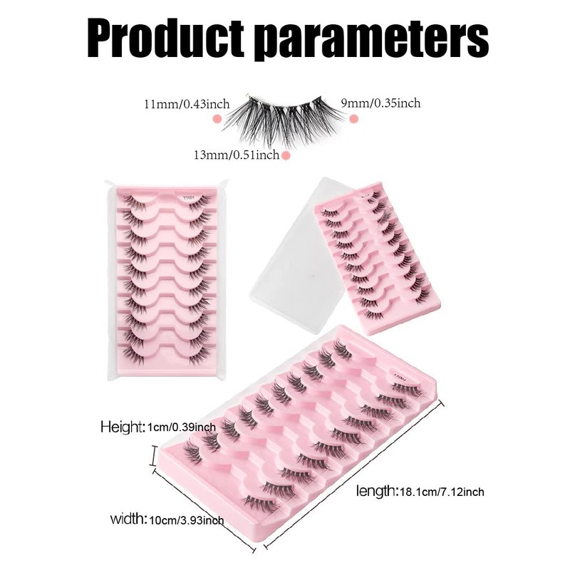 - Half False Eyelashes Our SJBAUTYO set includes 10 pairs of high quality black fiber half lashes. The half length makes it easy to adjust to your lids and gives you a natural look.