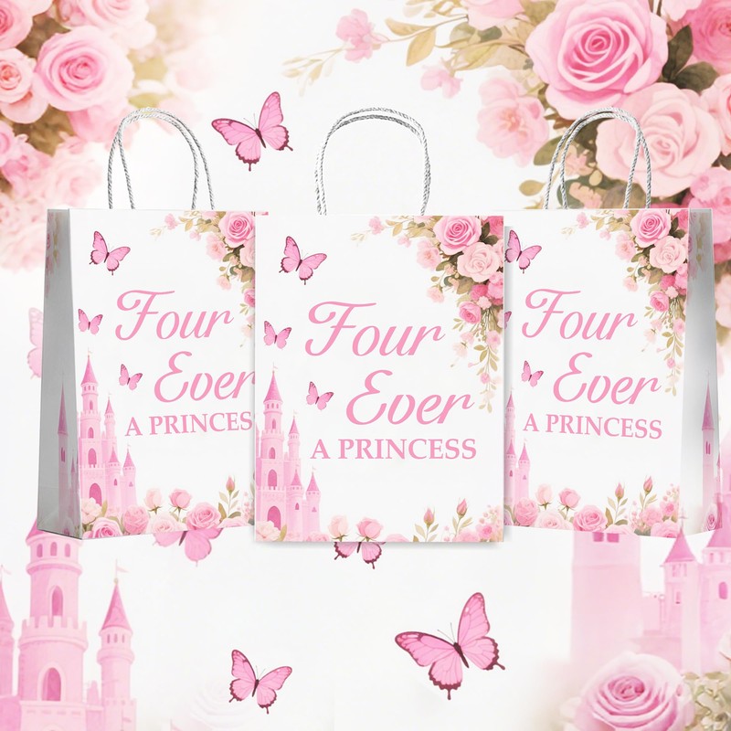- What you will receive - 20 x Four Ever A Princess Goodie Bags. Size:8.3 x 5.9 x 3.1 inches. This Goodie Bags adding a touch of glamour to your birthday party decorations. They're sure to catch the eye and create a festive atmosphere.