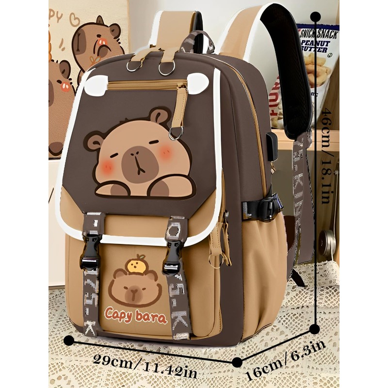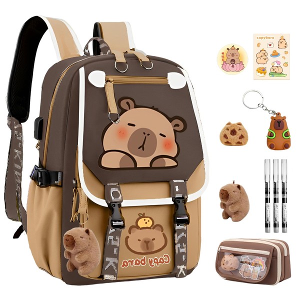 SJIE Waterproof Capybara Backpack,Large-capacity Kawaii capybara bag with 11-Piece Accessories (Badges, Pendants, Plush capybara, Stickers and others)