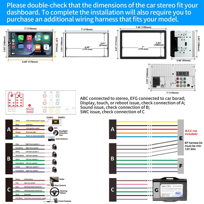 - Important Tips: ①Please make sure your dash board opening size fits our car stereo. If our stereo size does not meet your dash size, you will need to purchase an additional suitable dash kit. ②Please read the instructions before installation and it is recommended to install at a professional car audio shop. ③Some car models also require two additional after accessories to complete the installation: Wire harness adapter and radio antenna adapter for your car model.