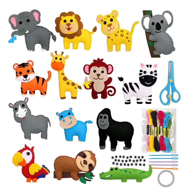 - Children's sewing kit: Our sewing children's set contains 14 pre-cut animal shapes made of felt, 11 embroidery threads, 5 plastic needles, 1 pack of safety eyes, 1 roll of tape, 1 pair of scissors and filling cotton. Encourage your child's creativity and learn basic sewing skills