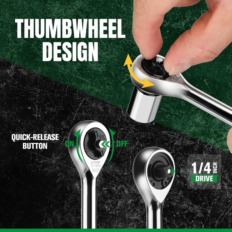 SK 1/4" Drive Ratchet Handle, 216-Position 6 Pawl Ratchet, with Quick-Release Button, Premium CR-V Construction, with Contoured Handle