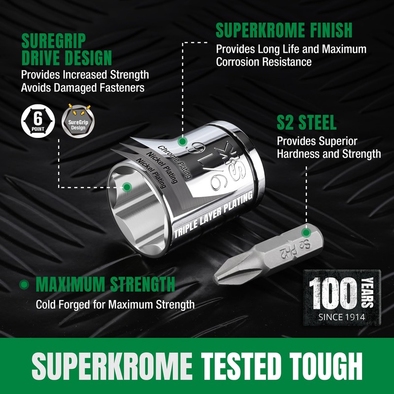 • Chrome Vanadium Steel ensures durability and extreme torque strength. SuperKrome Plating delivers toughest finish with high polish plating which results in jewelry-like finish providing long life and maximum corrosion resistance. The bits are made of heat treated S2 steel, providing more impact strength and toughness
