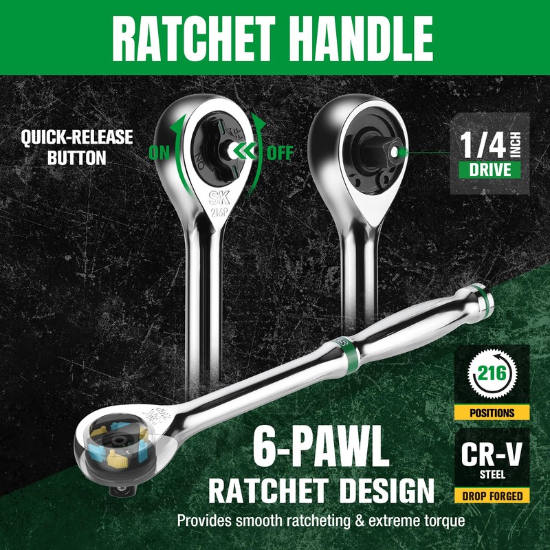 SK 1/4" Drive Socket Set with 216-P Quick-Release Ratchet, Socket Bits Set, 3...
