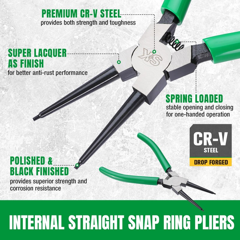 - Crafted from premium CR-V steel with a black finish for superior rust resistance, the snap ring pliers are heat-treated to achieve strength and ductility, ensuring they can withstand pressure without deformation