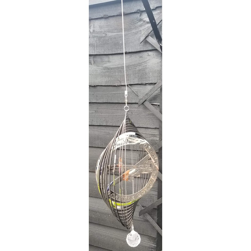 Polished Stainless Steel Wind Spinner - RAF Lancaster Bomber Design Laser cut, 3D effect with 3cm crystal hanging Lightweight, easy to hang and simply twist the spinner into shape for 3D effect Constructed from stainless steel so is weather proof for the garden Wonderful lightweight design requiring very little wind to spin and adds movement to the garden Alternative design for the home positioned near a door or window where with a small breeeze they will spin and catch the light beautifully Individually flat packed with scratch proof wrapping Battery driven motors are sold separately for consistent movement in the home Measures approximately 55cm high x 26cm wide x 15cm deep when fully opened, complete with clip and extension cord