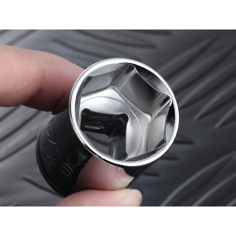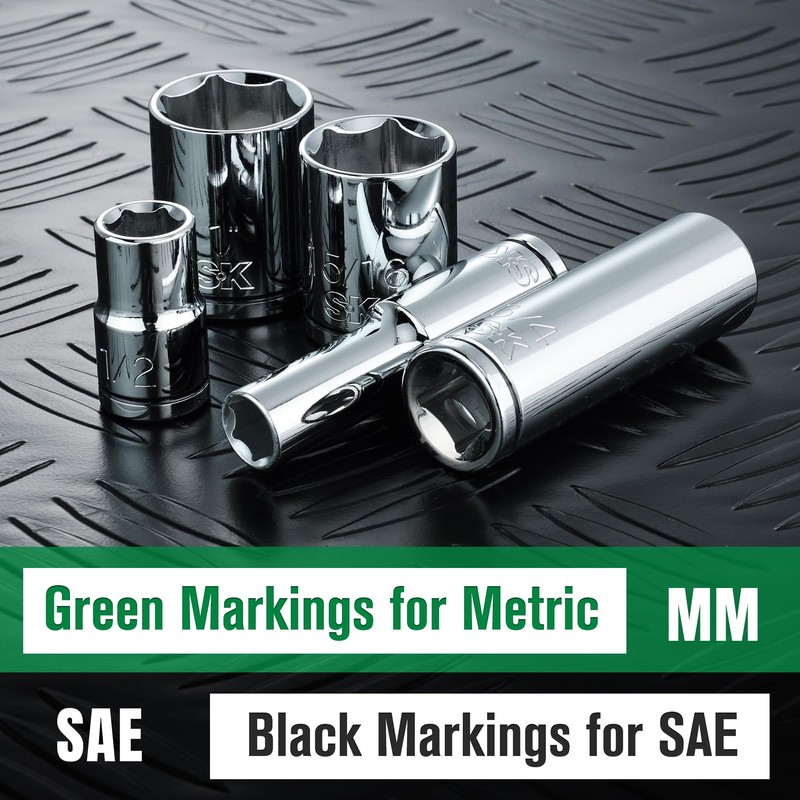 - Socket sizes include: 3/8", 7/16", 1/2", 9/16", 5/8", 11/16", 3/4", 13/16", 7/8", 15/16", and 1" with visible size markings and color-coded rings for easy identification.