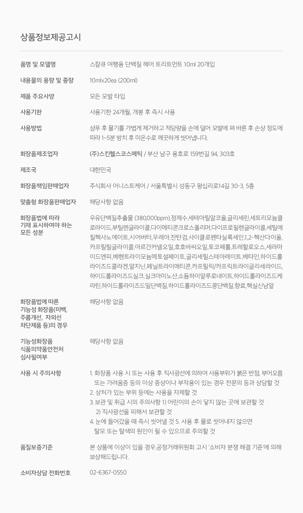 SkalQ Travel Protein Hair Treatment 10ml 20 packs / 스칼큐 여행용 단백질 헤어 트리트먼트 10ml 20개입
