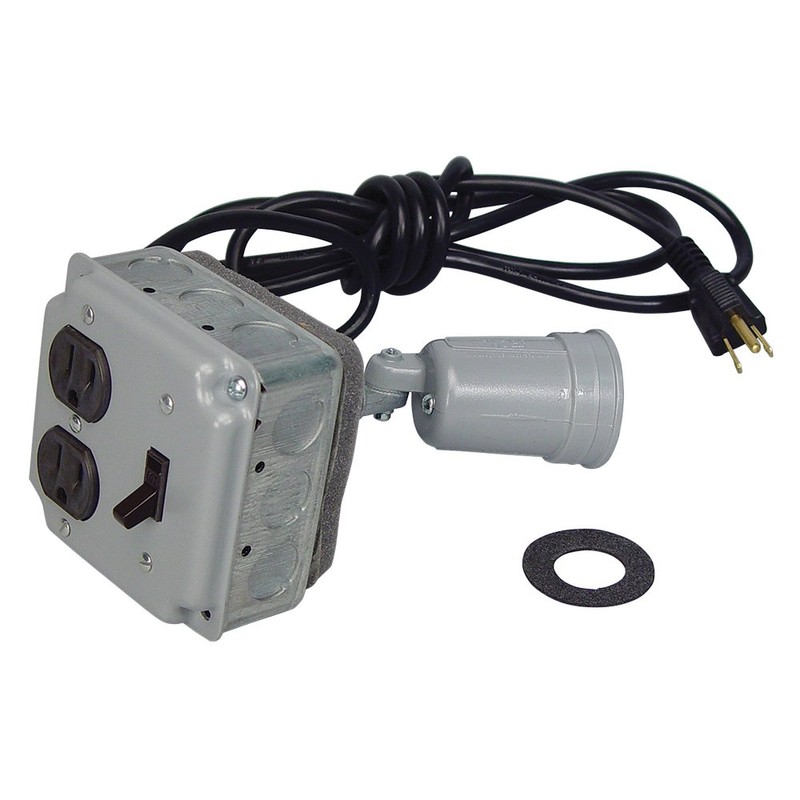 - Complete Floodlight Assembly includes: floodlight holder, switch, 18 gauge cord, duplex assembly, mounting hardware and gasket, no bulb. 115 volt, 12 amp.