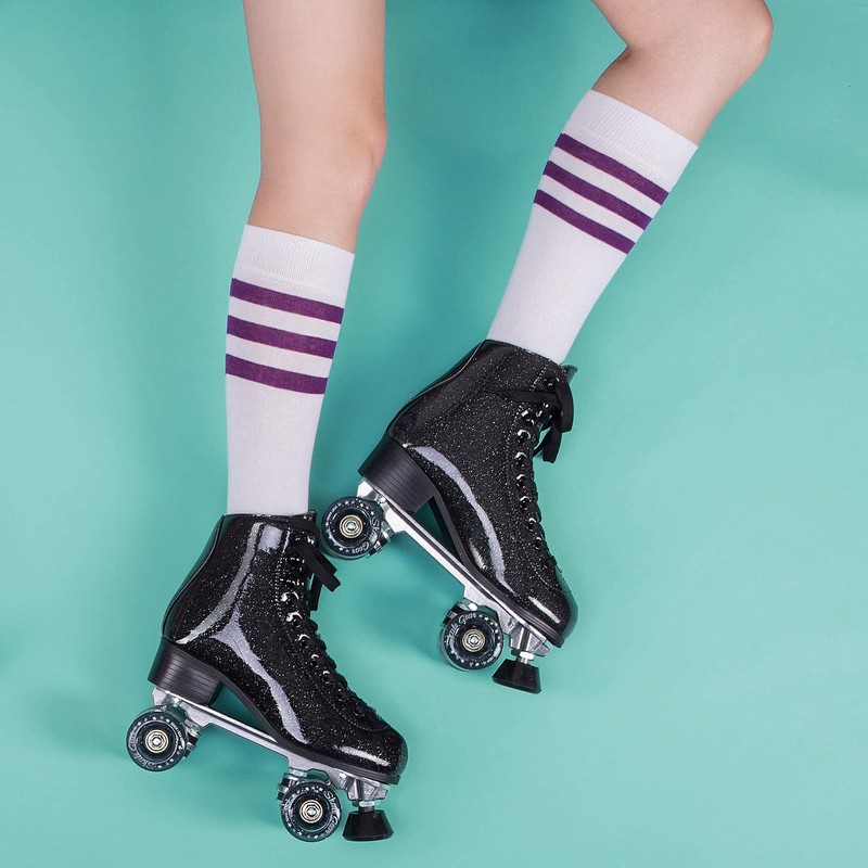 Skate Gear Sparkly Retro Quad Roller Skates (Glitter Black, Women's 8 / Men's 7)