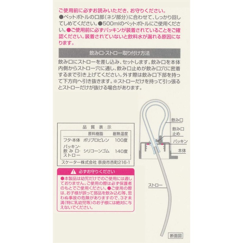 Skater PSHC10-A Long Straw Plastic Bottle Cap with Lid, 16.9 fl oz (500 ml), Straw Spout, 5.5 inches (14 cm)