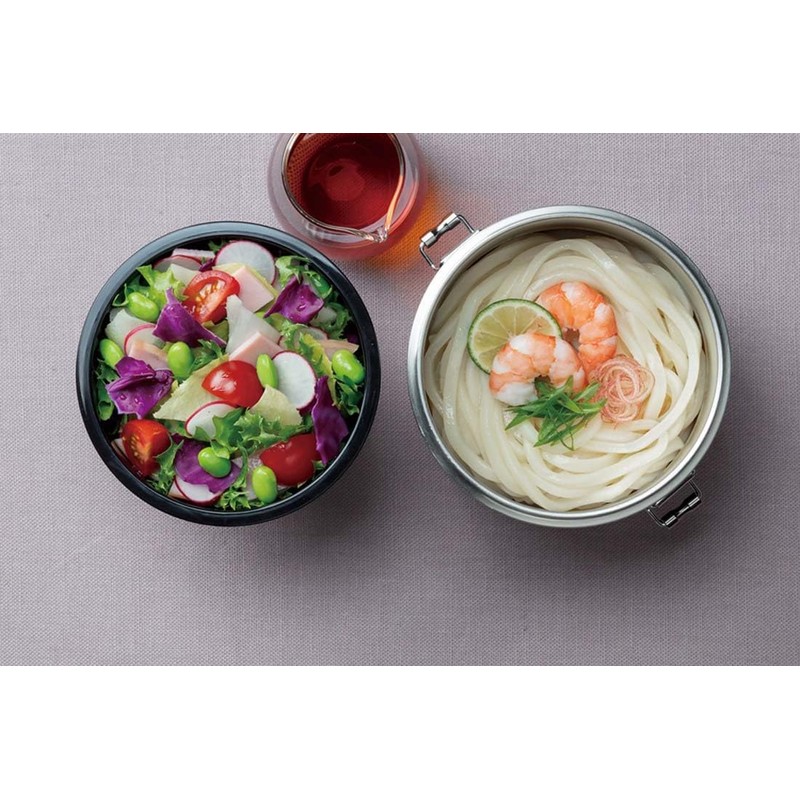 - Materials: body/lid: stainless steel (acrylic resin coating); closure: stainless steel; inner container/inner lid: polypropylene; seal: silicone rubber; base plate: elastomer