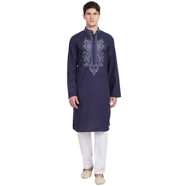 SKAVIJ Men's Cotton Embroidered Kurta Pajama Set Ethnic Woven Design Festive Party Dress (KP078blue_Blue_S)