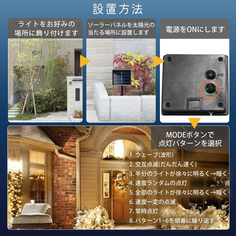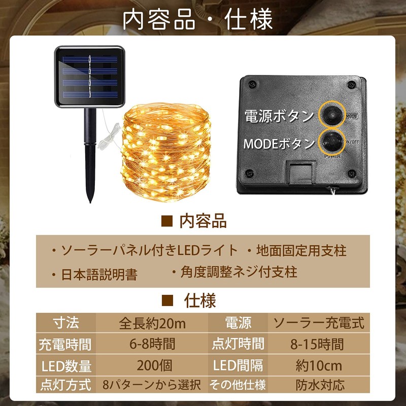 SKD Illumination Light, Solar Light, Large Panel, Up to 15 Hours of Light, Waterproof, 200 LED, 66.8 ft (20 m), Japanese Manual Included (Gold)