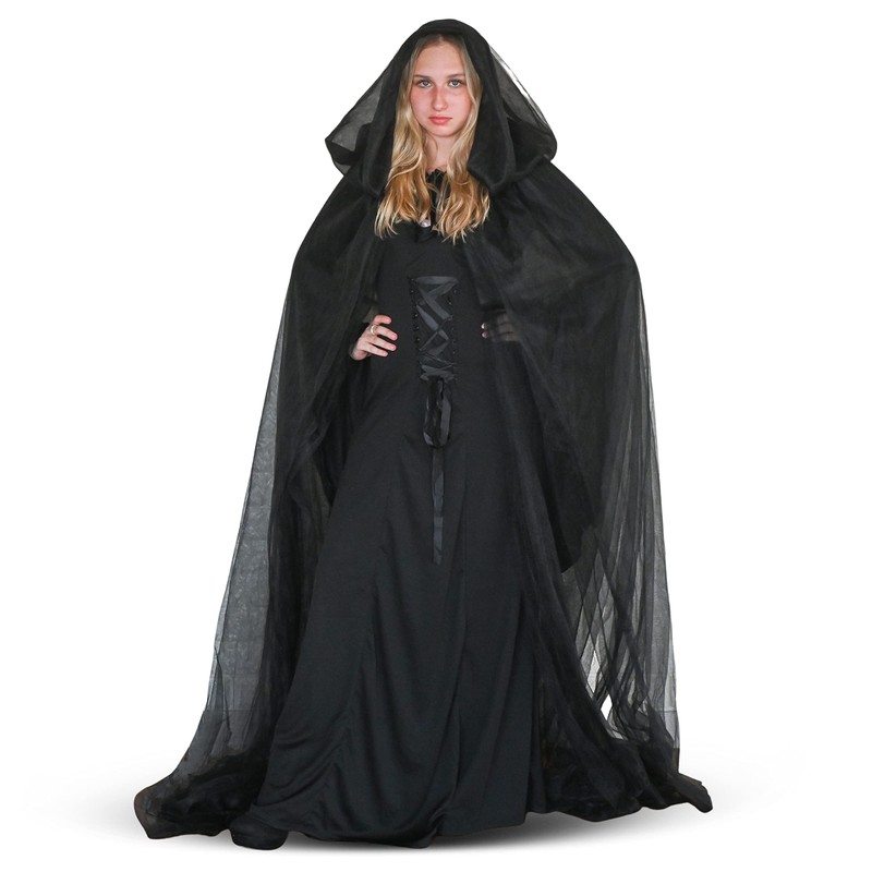 Skeleteen Black Hooded Tulle Cape - Long Chiffon Medieval Net Robe Vampire Bride Sheer Cloak Costume for Adults and Teens