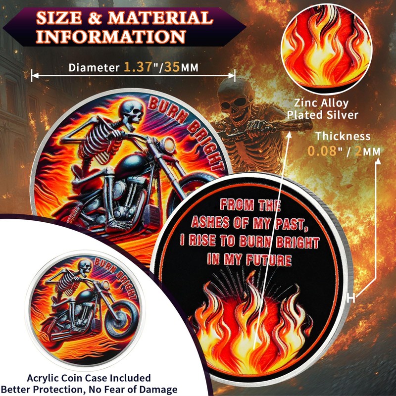 Skeleton Rider Sobriety Coin, Burn Bright NA AA Medallion - Inspirational Recovery Anniversary Token, Non-Religious Sobriety Gifts for Men Women, Addiction Recovery Affirmation Coin