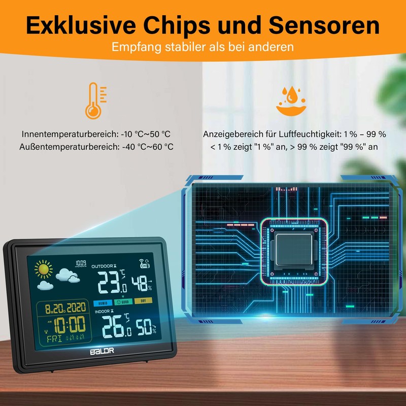 Skeufy Wireless Weather Station with Outdoor Sensor, Indoor and Outdoor Temperature, Humidity, Wireless Weather Station with Weather Forecast, Barometer, Digital Colour Display, DCF Radio-Controlled