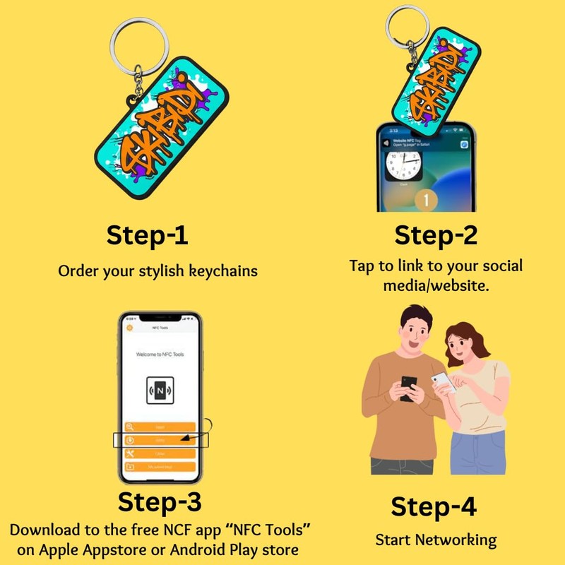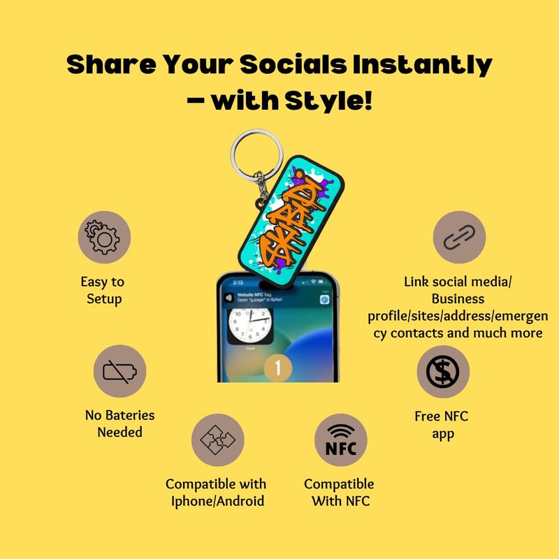 Slay & Connect" NFC keychain is the must-have accessory for every Gen Alpha queen and mid-twenty trendsetter. This vibrant, aesthetic keychain isn't just a pretty face; with its built-in NFC, you can instantly share your Instagram, emergency contacts, or any essential deets. It's the perfect blend of cute and tech-savvy, making it the ideal phone accessory or bag charm that's both stylish and super functional. To program keychain use NFC tools App, Available on Android and iOS