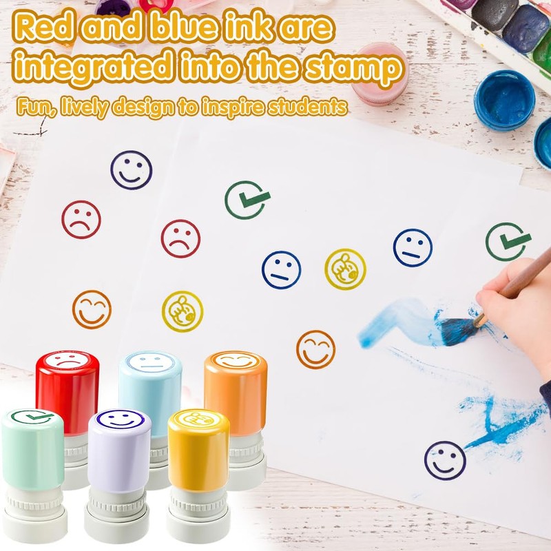 - 6 self-inking teacher stamps: colourful stamps teacher self-inking promote confidence and academic growth with various inspiring and leading messages. Our teacher stamp set contains 6 different colour designs: four different emoticons, thumb up design, √ sign.